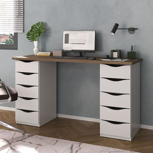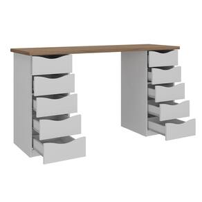 Organize-se para maior produtividade com a Escrivaninha Due, projetada para conciliar elegância, requinte e conforto. Sua forma versátil faz desta mesa perfeita para ser usada em diversos ambientes com estilos diferentes, como em escritório, home office ou quarto, sempre dando um toque especial. 10 amplas gavetas garantem um produto útil e multifuncional, e seu design elegante deixa qualquer ambiente sofisticado e de alto padrão. O espaçoso tampo garante muito conforto e comodidade, para você trabalhar ou estudar com amplo espaço para seu computador, notebook, papéis, livros e outros materiais. O revestimento é feito em BP, proporcionando resistência a impactos, atrito e umidade, certificando uma maior durabilidade ao móvel. O produto perfeito para aumentar o bem estar e a eficiência no trabalho, já que possui o tamanho ideal para maior conforto e produtividade!