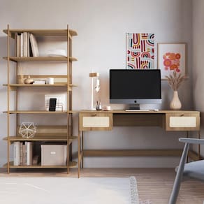 Estante Livreiro e Escrivaninha 28974, o conjunto ideal para tornar seu home office mais elegante! Estruturas Metálicas com acabamento em pintura epóxi. Composto por prateleiras e base em MDP 15 mm e acabamento BP, cantos arredondados, fundo em MDF 3 mm, gavetas com corrediças metálicas (mesa) e detalhes em aplique em tela sintética (PVC) imitando palhinha e puxadores em Poliestireno (dourado). Destaque fica para a travessa inferior em MDP e longarina metálica anti empenamento. Produto será entregue em 02 volumes.
