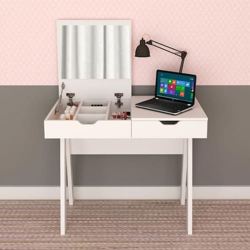 Conheça a Penteadeira Escrivaninha PE2019, uma peça versátil que une funcionalidade e elegância. Ela conta com uma gaveta e uma abertura basculante, oferecendo espaço ideal para organizar seus itens de maquiagem, anéis, cremes e pulseiras. O espelho de 3mm proporciona praticidade no dia a dia, enquanto o material em MDP com acabamento em pintura UV assegura durabilidade e um visual moderno.