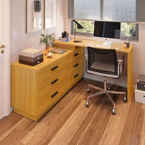 Fabricada com materiais de alta qualidade, a Escrivaninha em L Cômoda Leonie é durável, resistente e ideal para quem busca um ambiente de trabalho mais organizado e elegante.
