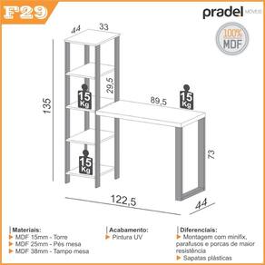 Escrivaninha Em Mdf 5 Prateleiras 123 X 44 Cm Freijó/preto Fosco Pradel Dalla Costa A Escrivaninha F29JPF da Pradel Dalla Costa é uma peça de mobiliário ideal para quem busca design e praticidade. Fabricada em MDF de alta qualidade, apresenta dimensões de 123 cm de largura por 44 cm de profundidade, adequada para ambientes compactos. O acabamento na cor freijó com detalhes em preto fosco confere elegância e versatilidade, permitindo sua integração em diferentes estilos de decoração. Este móvel conta com 5 prateleiras que oferecem excelente espaço de armazenamento para livros, materiais de escritório ou objetos decorativos. A escrivaninha é robusta, durável e projetada pensando na otimização do espaço, ideal para escritórios domésticos, quartos de estudantes ou qualquer área de trabalho. Linha ou Coleção - Industrial Garantia do fabricante - 12 Modelo - F29JPF Largura (cm) - 122.5 cm Profundidade (cm) - 44 cm Altura (cm) - 135 cm Material Principal - MDF Material da Estrutura - MDF Material da Prateleira - MDF Distância entre prateleiras - 29.5 cm Acabamento - Pintura UV Acabamento da Estrutura - Pintura UV Necessita Montagem - Sim Suporta Até (kg) - 15 kg Possui Porta - Não Possui Gavetas - Não Possui Suporte para CPU - Não Possui Passa Cabos - Não Possui Iluminação - Não Cor - Freijó/Preto Escala de Brilho - Fosco Origem do Produto - Nacional Quantidade de Itens - 1 Ambiente - Escritório Mais Informações - Pintura UV;MDF 25mm Pés;MDF 38mm Tampo;Sapatas Plásticas;Montagem com Parafusos e Porcas de maior Resistência. Recomendações de Uso - Não utilize produtos de limpeza abrasivos, alvejantes ou solventes, pois podem danificar o acabamento do MDF;Use produtos de limpeza específicos para móveis, seguindo sempre as instruções do fabricante;Mantenha uma rotina regular de limpeza para evitar o acúmulo de sujeira e poeira, o que pode levar a arranhões no longo prazo;Evite a exposição prolongada ao sol, que pode descolorir ou danificar o acabamento do MDF ao longo do tempo. Marca - Pradel Peso (kg) - 19.4 kg Garantia do Fabricante - 6 meses para defeitos de fabricação EAN - 7908155303362 Aviso sobre o produto - Todas as imagens são meramente ilustrativas Marca: DALLA COSTA MÓVEIS