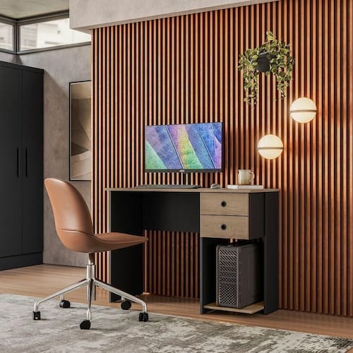 Esta mesa foi desenvolvida para completar seu escritório ou ambiente de estudo. Possui design compacto e ergonômico, que ajuda na otimização do espaço e promove o conforto necessário para acompanhar os momentos de trabalho e aprendizado. Possui uma prateleira elevada para o CPU e duas gavetas para melhor organizar seus objetos.Informações do produto:Altura: 75 cmLargura: 100 cmComprimento: 45 cmInformações adicionais:Material: MDP 15 e 12mmCor: Preto Fosco/Carvalho RústicoGaveta: Sim (2)Nichos: NãoPorta: NãoSuporte para Gabinete: SimEmbalagem feita com papelão revestido por plástico, com isomanta e com BUP's (proteção de cantos) para garantir a qualidade do produto;Excelente acabamento revestido em pintura UV, que dá maior destaque à cor;Estrutura produzida com materiais de alta qualidade.Itens incls:01 Escrivaninha.Kit completo para montagem, manual detalhado de instruções para montagem. Garantia:3 meses contra defeito de fabricação.Informações complementares:- Fotos meramente ilustrativas do produto no ambiente.- Os objetos que ambientam as fotos não acompanham o produto;- Verificar descrição e tamanho do produto antes da compra.- Avaliar a mercadoria no ato do recebimento e recr em caso de divergência ou s.- Mantenha as informações de contato e endereço de atualizados para entrarmos em contato caso necessário.- Limpar com flanela ou pano macio seco, não utilizar produtos abrasivos, desengordurantes, álcool ou solvente. Não expor o produto diretamente à luz solar e à umidade.* Sugerimos a contratação de um montador para a montagem do produto. Não nos responsabilizamos por s cadas no ato da montagem.* Não nos responsabilizamos pela montagem e desmontagem do produto no ato da e devolução, assim como os custos gerados nestas situações.* A transportadora rá o produto no andar térreo do endereço de .* Não nos responsabilizamos por subir escadas, corredores e elevadores ou transporte por guincho em apartamentos.