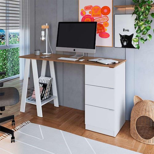 que tal a escrivaninha faya?fica mais fácil se concentrar e prodr hor quando o ambiente está organizado e com tudo no lugar certo para nos auxiliar, né? É por isso que uma boa escrivaninha é essencial para quem estuda ou trabalha em casa. com tampo espaçoso para receber um notebook, caderno, luminária e outros materiais essenciais à rotina, o modelo faya também é excelente para aqueles objetos que você precisa ter rápido alcance, pois tem 3 gavetas. enquanto toda essa funcionalidade deixa o dia a dia mais prático, o design deixa mais bonito: cor clássica, estrutura de bom gosto e detalhes que fazem a decoração ficar ainda mais especial e de bom gosto, do jeitinho que você merece ;) Marca: Modern