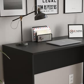 Com um design moderno e funcional, esta escrivaninha é ideal para compor ambientes de home office ou estudo. Com acabamento em linhas retas, ela proporciona elegância e praticidade, acomodando perfeitamente notebooks, luminárias e itens de papelaria. Compacta e versátil, combina com diversos estilos de decoração, otimizando o espaço com organização e sofisticação.