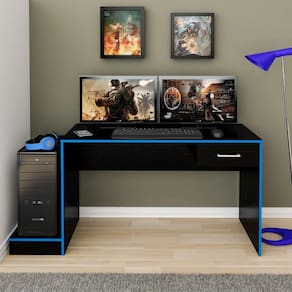 A Escrivaninha Gamer foi pensada no seu corforto para horas na frente do PC. Torne seu momento de estudo, jogos ou trabalho muito mais agradável com a Escrivaninha Gamer! Com design arrojado, seu amplo tampo possui espaço para até dois monitores. Seu CPU ficará em um espaço elevado, sem contato com o piso. Seu ambiente para jogos ficará mais confortável para que possa ficar horas e horas jogando tranquilamente sem incômodos. Acabamento: Pintura UV Texturizada Acabamento da Gaveta: Pintura Texturizada UV Altura: 74,5 cm Ambiente Principal: Escritório Complexidade da Montagem: Baixa: pode ser montado por uma pessoa sozinha Cr: Preto/Azul Cr do Produto: Preto/Azul Cr Interna: Preto Escala de Brilho: Fosco Escala de Brilho da Gaveta: Fosco Estilo: Moderno Formato: Retangular Gaveta com Chave: Não Itens Inclusos: 1 Escrivaninha, Kit Ferragem e Manual de Montagem Largura: 160,5 cm Manual de Montagem e Instalação: https://cdn2.madeiramadeira.com.br/atributo/artely/747842-escrivaninha-gamer-1-0.pdf Material da Gaveta: MDP Material do Puxador da Gaveta: Plástico Material Principal: MDP Necessita Montagem: Sim Origem do Produto: Nacional Peso: 22,8 kg Peso Máximo por Gaveta: 1 kg Possui Gavetas: 01 Possui Passa Cabos: Não Possui Pés: Não Possui Porta Objetos: Não Possui Portas: Não Possui Prateleiras: Não Possui Rodízio: Não Possui suporte para CPU: Sim Possui Suporte para Teclado: Não Profundidade: 55,5 cm Recomendações de Uso, Manutenção e Limpeza: Não limpar com álcool ou qualquer outro produto químico. Utilize somente pano seco ou levemente umedecido. Sapatas Niveladoras: Não Sistema de Montagem: Cavilhas, minifix, tambores, parafusos, cantoneiras, puxador, Suporte angular, kit corrediças Suporta Até (kg): 20 kg Tamanho: Tipo de Corrediça da Gaveta: Metálica Simples Tipo de Puxador da Gaveta: Externo