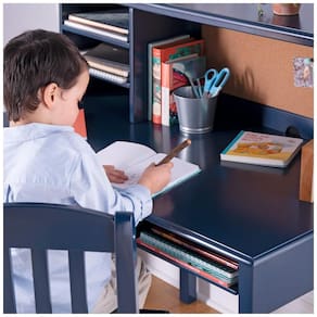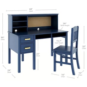 Conjunto infantil completo de escrivaninha, hutch e cadeira em madeira, desenvolvido para oferecer estação de estudo, leitura, computador e atividades criativas para crianças a partir de 5 anos. O design em estilo clássico, com acabamento azul-marinho, integra mesa com gavetas, nichos abertos e quadro de cortiça, criando um ponto fixo de estudo em quartos e salas de brincar.?