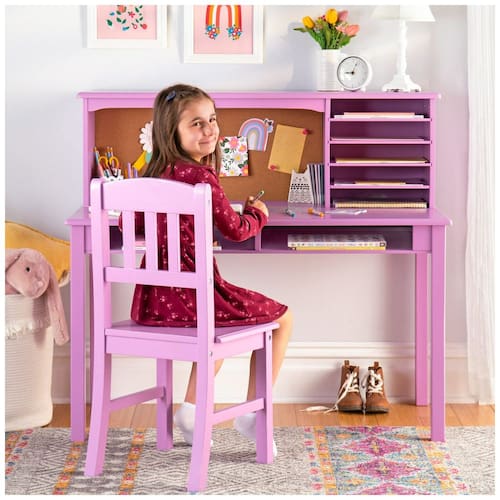 A escrivaninha infantil Guidecraft Kids’ Media Desk and Chair Set em lavanda foi projetada como estação de estudo e criação para crianças, reunindo mesa com tampo amplo, hutch superior com nichos e cadeira coordenada em madeira. A estrutura utiliza madeira de bétula e madeira engenheirada com acabamento laqueado de fácil limpeza, adequada para uso diário em quartos infantis e áreas de estudo.?