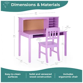 Marca: Guidecraft? Fabricante: Guidecraft? Linha / Estilo: Kids’ Media Desk? Modelo: G27653? Tipo de produto: Escrivaninha infantil com hutch e cadeira? Cor: Lavanda? Estilo: Moderno? Formato: Retangular? Material da estrutura da mesa: Madeira de bétula e madeira engenheirada com acabamento laqueado? Material da cadeira: Madeira com acabamento lavanda? Componentes principais: Mesa com tampo amplo, hutch superior com nichos, cadeira infantil? Recursos de armazenamento: 5 nichos abertos no hutch e compartimentos no tampo para livros e papéis? Painel de cortiça: Painel de cortiça integrado ao hutch para fixação de lembretes e produções? Passagem para cabos: Recortes para organização e passagem de cabos de equipamentos eletrônicos? Largura da mesa (L): 112 cm? Profundidade da mesa (P): 61 cm? Altura total da mesa com hutch (A): 102 cm? Altura do tampo: 66 cm? Dimensões aproximadas da cadeira (L x P x A): 39 cm x 39 cm x 81 cm? Altura do assento da cadeira: 39 cm? Faixa etária recomendada: Aproximadamente de 5 a 12 anos? Capacidade de carga da mesa: Até 57kg distribuídos? Ambiente de uso indicado: Quarto infantil, área de estudos, brinquedoteca ou sala de aula? Peso do pacote (produto + embalagem): 32,5kg? Cuidados de limpeza: Limpar superfícies com pano seco ou levemente úmido; evitar produtos abrasivos? Requer montagem: Sim, montagem por adulto? Ferragens e ferramentas: Ferragens e instruções de montagem incluídas? Conteúdo da caixa: 1 escrivaninha infantil Kids’ Media Desk lavanda com hutch, 1 cadeira infantil, ferragens e manual de montagem? Manual do usuário: Inglês? Marca: Não Informado