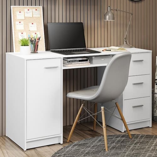 Cor: Branco | Garantia: 3 meses contra defeitos de fabricação | Dimensões - Altura: 77 cm | Dimensões - Largura: 136 cm | Dimensões - Profundidade: 45 cm | Produto: Mesa para Escritório | Marca: Madesa | Peso aproximado: 30 KG | Tonalidade: Branco | Material: MDP | RBN: Móveis/Móveis para Escritório em Casa/Mesas, Escrivaninhas e Estações de Trabalho | Tipo: Sem rodinhas | Cômodo Indicado: Home Office | Instruções/Cuidados: Utilize um pano limpo, levemente umedecido e seque em seguida a superfície. Não usar produtos químicos ou abrasivos para a limpeza. Recomendamos polir seu móvel com lustra-móveis duas a três vezes por ano. | Conteúdo da embalagem: 1 Escrivaninha | Produto precisa de Montagem?: Sim, sugerimos a contratação do nosso serviço de montagem (para os CEPs em que o serviço está disponível) ou de algum experiente de sua preferência | Altura do Produto com Embalagem (cm): | Largura Produto Com Embalagem (cm): | Comprimento Produto Com Embalagem (cm): 147 | Peso Produto Com Embalagem (Kg): | Nome do Simples no Fornecedor: Escrivaninha Madesa Alaska 3 Gavetas 1 Porta | Descrição do Tamanho: 77 cm x 136 cm x 45 cm | Tempo de do Fornecedor (dias): 1 | | Estado de Origem: RS | Material para Filtro: MDP | Fabricante: Madesa | Cor: Branco