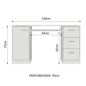 Possui tampo de madeira, três gavetas espaçosas com corrediças metálicas e um nicho abaixo do tampo com abertura na parte de trás. Além disso, conta com uma porta com dobradiça metálica e espaço interno para guardar objetos.