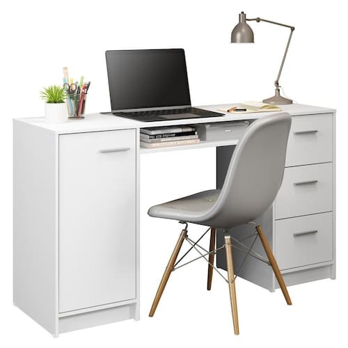 Itens inclusos: - Uma (1) Escrivaninha com três (3) gavetas, uma (1) porta, um (1) nicho, tampo em MDP e puxadores em PVC