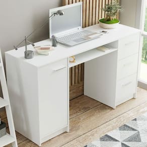 A escrivaninha Alaska possui tampo amplo, três gavetas com corrediças metálicas e um nicho abaixo do tampo, com abertura na parte de trás. Além disso, conta com uma porta com dobradiça metálica e ótimo espaço interno para guardar objetos.