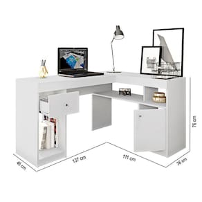 Escrivaninha Mesa Computador De Canto Office 137cm Suzan C01 - D'rossi Cor Branco Se você procura uma solução inteligente para otimizar seu ambiente de trabalho ou estudo, a Escrivaninha Mesa Computador de Canto Office 137cm Suzan é a escolha certa. Produzida em MDP de 15 mm e HDF de 2,5 mm, ela alia resistência, durabilidade e um acabamento sofisticado em pintura UV. O formato em ?L? é ideal para aproveitar ao máximo cantos e pequenos espaços. Pensando em funcionalidade, o móvel conta com uma porta de bater com dobradiças metálicas, além de uma gaveta com corrediça telescópica para um deslizamento suave e durabilidade superior. Os nichos e a prateleira adicional proporcionam ainda mais espaço para organizar os objetos. Os pés com mini sapatas plásticas garantem estabilidade e proteção ao piso. O puxador metálico em PVC adiciona um toque de delicadeza e sofisticação ao móvel. Com amplo espaço, a Escrivaninha de Canto Office Suzan é deal para quem valoriza praticidade e organização! Dimensões do Produto: Altura: 76 cm Largura: 137 cm Profundidade: 111 cm Peso: 39 kg Especificações do Produto: Material da Estrutura: MDP15 mm e HDF 2,5 mm Acabamento: Pintura em UV Escala de Brilho: Fosco Formato da Mesa: Formato em L Peso suportado no topo: 10 Kg Peso Suportado: 80 kg distribuídos Possui Portas: Sim Quantidade de Portas: 1 Porta Tipo de Porta: Convencional Material da Dobradiça: Metalica Possui Nichos: Sim Quantidade de Nichos: 2 Nichos Possui Prateleiras: Sim Quantidade de Prateleiras: 1 Prateleira Possui Pés: Sim Quantidade de Pés: 14 Pés Material dos Pés: Mini sapata Plástico Possui Puxador: Sim Material do puxador: Metálico em PVC Possui Gavetas: Sim Quantidade de Gavetas: 1 Gaveta Material da Corrediça: Telescópica Possui Rodízios: Não Montagem Invertida: Não Pode ser Montado Invertido Possui Passa Fio: Sim Possui regulagem de altura: Não Possui LED: Não Possui Vidro: Não Possui Chave: Não Necessita de Fixação na Parede: Não Diferenciais: Design moderno; Amplo espaço; Puxador pontual delicado. Sistema de Montagem: Parafusos/Cavilhas/Minifix Manual de Montagem: Sim Complexidade da Montagem: Média Montagem: Recomendamos que seja feita por um Garantia: 90 dias contra de fabricação Instruções de Limpeza: Utilizar um pano limpo e levemente úmido Quantidade de Volumes: 1 Caixa Medida das Embalagens: Caixa 1: 117,4x45,3x15,2cm : É feita somente até o térreo ou portaria. Confira sempre as medidas das embalagens para assegurar que o produto passe por portas e escadas do .
