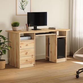 No lado esquerdo, as três gavetas espaçosas com puxadores torneados de madeira no mesmo tom são perfeitas para manter tudo à mão, mas longe da vista. Acima delas, um nicho aberto comporta documentos e itens de uso rápido. No lado direito, o compartimento com duas prateleiras reguláveis oferece flexibilidade para armazenar CPU, livros ou objetos decorativos.