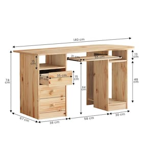 Com 140 cm de largura, oferece generosa área de trabalho para computador, livros e acessórios, enquanto a bandeja retrátil para teclado mantém o tampo livre, garantindo postura confortável e ergonômica.