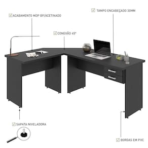 Escrivaninha Mesa De Escritório Em L 1,80x1,40m C/02gavetas Preto ônix Sobre o ProdutoModelo: A Definir No Ato Da CompraDescrição: O conjunto é um verdadeiro escritório em um só produto. Com design minimalista, projetada para se encaixar no seu espaço, pode ser montada em diversas composições, direita, esquerda ou em linha. Possui 01 escrivaninha c/02 gavetas, 01 conexão e 01 escrivaninha auxiliar, sendo perfeita para ser usada no seu escritório ou sala. Itens Inclusos:01 Mesa / Escrivaninha Informações Logí Comp: 1250mm / Prof: 640mm / Alt: 60mm / Vol: 01 / Peso: 23,28 Comp: 820mm / Prof: 640mm / Alt: 80mm / Vol: 01 / Peso: 15,65 Comp: 430mm / Prof: 340mm / Alt: 80mm / Vol: 01 / Peso: 5,23 KgObservações: Não Acompanha Acessórios Decorativos. Imagens Meramente Ilustrativas.Informações TécnicasMaterial Estrutura / Tampo: Mdp Bp AcetinadoEspessura Do Material: Estrutura: 15mm / Tampos 30mm EngrossuradoAcabamento / Revestimento: Bp AcetinadoFita De Borda: Pvc Escala De Brilho: Fosco Gavetas: Sim ? 02 Sem ChaveCorrediças: MetálicasPuxadores: Plástico Abs Necessita De Montagem: Sim ? Acompanha Manual De MontagemEmbalagens: Caixa De Papelão / Cantoneira IsoporGarantia: 06 Meses Contra De Fabricação Medidas Dos Produtos:Escrivaninha C/02gavetas: Comp: 1,20m / Prof: 0,60m / Alt: 0,74m Conexão : Comp: 0,60m / Prof: 0,60mEscrivaninha Auxiliar: Comp: 0,80m / Prof: 0,60m / Alt: 0,74m Material: MDP | Acabamento: BP Acetinado | Escala de Brilho: Fosco | Fita de Borda: PVC | Gavetas: Sim | Corrediças: Metálicas | Tipo de Produto: Mesa | Fabricante: Compace | Comprimento: 180 | Largura: 140 | Altura: 30 | Profundidade: | Preço tabelado: 535 | Cor: | Móvel Dobrável: | Recursos da Escrivaninha: | Duração da Garantia: | Tipo de Mesa: | Marca: | País de Origem: | Desing da Escrivaninha: | Base da Mesa: | Montagem: | Coleção de Antiguidade: | Dimensões do Produto (A x L x C), sem a caixa de embalagem: | Produto personalizado: | Recursos da Mesa: | Tipo de Garantia: | Código Anvisa do Produto: | Motivo de Isenção Anvisa: | Data de validade Anvisa: | Shape: | Formato da Escrivaninha: | Tamanho Do Pacote: | Formato do Espelho: | Temas de Estampas: | Nr. do Lote do Produto: | de Assentos: | Altura da Mesa: | Funcionalidades: | Qtd. de Produto no Lote: | Estilo: | Quantidade: Cor: Preto Ônix