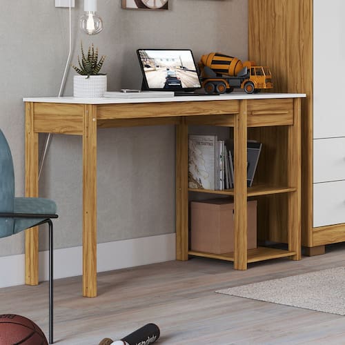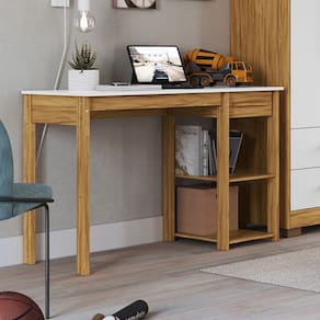 A Escrivaninha Mesa de Estudo 1 Gaveta em MDF Popy Móveis Peroba combina organização, estilo e funcionalidade em um só móvel. Ideal para estudos ou home office, possui tampo amplo, gaveta com corrediças telescópicas e prateleiras laterais que otimizam o espaço. Seu design clássico e acabamento em pintura UV atóxica garantem durabilidade e elegância para qualquer ambiente.