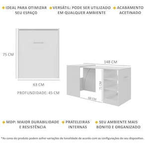 Dimensões do produto montado: Altura: 75cm | Largura: 63cm | Profundidade: 45cm Largura Mesa (aberta): 148cm *Você pode consultar as medidas internas na imagem técnica do produto.