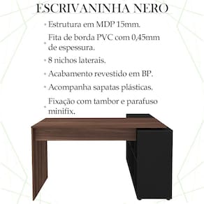 Escrivaninha Mesa Escritório 8 Nichos NE6 Ipê Preto, é a opção perfeita para quem busca conforto e funcionalidade em seus momentos de lazer ou home office. Estrutura em MDP de 15mm, proporcionando maior durabilidade e resistência à peça, contando com acabamento revestido em BP. Composta por 8 nichos laterais com amplo espaço, possibilitando a disposição de decorações e organização de demais objetos, conta com fita de borda PVC com 0,45mm de espessura, com uma finalização de alto padrão, pode ser montada para o lado direito ou esquerdo, adaptando-se ao seu espaço, acompanha sapatas plásticas. Perfeita para deixar seu ambiente produtivo, belo e organizado, ideal para ser utilizada em home office, escritório ou um cantinho de estudos. Este móvel chegará na sua casa separado em 01 volume.