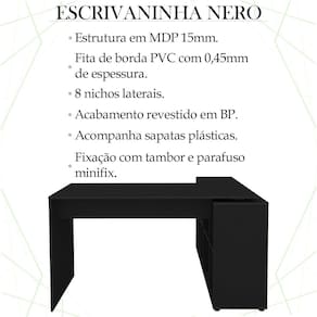 Escrivaninha Mesa Escritório 8 Nichos NE6 Preto, é a opção perfeita para quem busca conforto e funcionalidade em seus momentos de lazer ou home office. Estrutura em MDP de 15mm, proporcionando maior durabilidade e resistência à peça, contando com acabamento revestido em BP. Composta por 8 nichos laterais com amplo espaço, possibilitando a disposição de decorações e organização de demais objetos, conta com fita de borda PVC com 0,45mm de espessura, com uma finalização de alto padrão, pode ser montada para o lado direito ou esquerdo, adaptando-se ao seu espaço, acompanha sapatas plásticas. Perfeita para deixar seu ambiente produtivo, belo e organizado, ideal para ser utilizada em home office, escritório ou um cantinho de estudos. Este móvel chegará na sua casa separado em 01 volume.