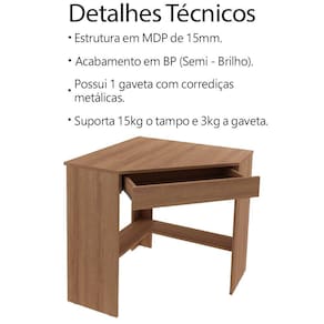 Escrivaninha Mesa Escritorio de Canto 76,5 cm ME4169, é a opção perfeita para quem busca conforto e funcionalidade em seus momentos de lazer ou home office. Estrutura em MDP de 15mm, proporcionando maior durabilidade e resistência a peça, contando com acabamento revestido em BP (Semi - Brilho). Composta por 1 gaveta com corrediças metálicas, 2 prateleiras para armazenar itens, acompanha sapatas plásticas. Suportando até 15kg o tampo e 3kg cada gaveta. Perfeita para deixar seu ambiente produtivo, belo e organizado, ideal para ser utilizada em home office, escritório ou um cantinho de estudos. Este móvel chegará na sua casa separado em 1 volume.