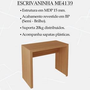Escrivaninha Mesa Escritorio ME4139, é a opção perfeita para quem busca conforto e funcionalidade em seus momentos de lazer ou home office. Estrutura em MDP de 15mm, proporcionando maior durabilidade e resistência a peça, contando com acabamento revestido em BP (Semi - Brilho). Composta por tampo em MDP, com uma finalização de alto padrão e acompanha sapatas plásticas. Perfeita para deixar seu ambiente produtivo, belo e organizado, ideal para ser utilizada em home office, escritório ou um cantinho de estudos. Este móvel chegará na sua casa separado em 1 volume.