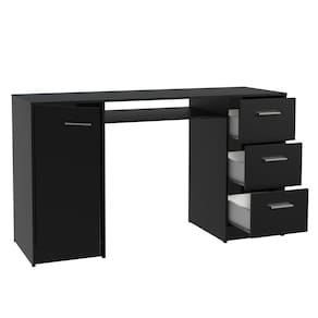 Possui tampo de madeira, três gavetas espaçosas com corrediças metálicas e um nicho abaixo do tampo com abertura na parte de trás.