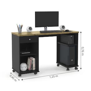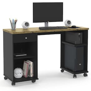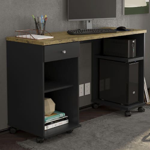 A Escrivaninha Million é versátil, robusta, prática, facilita o trabalho e o estudo. Ela é ideal para seu ambiente, conta com um tampo 25mm, um amplo espaço,nichos estrategicamente posicionados para melhor acomodar o seu CPU e seu estabilizador e suporte para teclado. Possui uma prateleira que é ideal para instalar roteadores, guardar livros etc. Possui também uma gaveta para armazenar seus pertences.