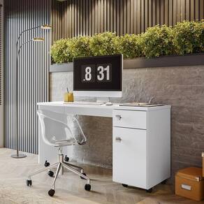 Pintura UV lisa/texturizada, resultando em um acabamento de alta qualidade e fácil manutençãícios e FuncionalidadesOrganização e : A gaveta com chave permite que você armazene documentos e objetos pessoais de forma segura e organizada, mantendo seu espaço de trabalho livre de bagunç Moderno: O acabamento em branco brilhante, combinado com os puxadores cromados, confere um visual contemporâneo e elegante ao seu escritório, ideal para qualquer ambiente.Durabilidade: Produzida com materiais de alta qualidade, a escrivaninha é robusta e resistente, perfeita para o uso diário, garantindo longevidade ao seu investimento.Praticidade: Os rodízios permitem que você mova a escrivaninha com facilidade, adaptando seu espaço conforme a necessidade, sem esforço.Observações ImportantesMontagem: A não oferece de montagem. Todos os móveis vêm com um manual de montagem que contém instruções passo a passo.Cuidados: Para manter a escrivaninha em ótimo estado, utilize um pano seco ou levemente umedecido para limpeza. Evite exposição direta ao sol e umidade excessiva.Imagens: As imagens do produto são meramente ilustrativas. Acessórios de decoração não estão údo da Embalagem1 Escrivaninha Office Malta com 1 Gaveta1 Manual de instruções