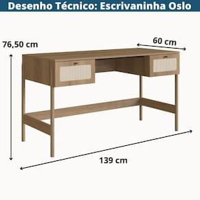 Produto: Escrivaninha Oslo Artesano 139 cm (largura) em MDP Palha Cor Mel Base Madeira | Cor: Mel | Materiais: MDP, Madeira | Tonalidade: Marrom | Estilo de Decoração: Urbano Contemporâneo | Cômodo Indicado: Escritorio | Linha: Oslo | Montagem: Desmontado | Marca: Artesano | Peso Suportado (kg): 19.00 | Área de : Interna | Garantia (tempo): 6 meses | Garantia (descritivo): Garantia contra defeitos de fabricação de 06 meses. Consulte as nossas políticas. | Peso (kg): 23.00 | Medidas: Largura (cm): 139.00 | Medidas: Profundidade (cm): 60.00 | Medidas: Altura (cm): 76.50 | Entregue Montado?: Não | Possui Manual de Montagem?: Acompanha o Produto | Origem do Produto: Nacional | Conservação e Manutenção: Limpeza com pano úmido em solução de água e detergente neutro. Secar em seguida. | Acabamento: Fosco | Número de Gavetas: 2 gavetas | Atributos: Elegante, Durável, Rústico, Resistente