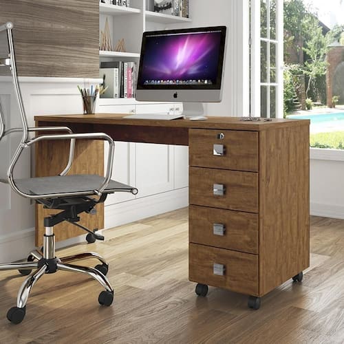 Praticidade: Os rodízios facilitam a movimentação da escrivaninha, permitindo reorganizar o espaço conforme necessário.