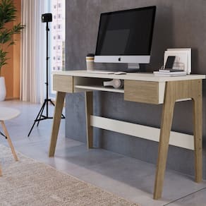 Mesa de Escritório 18002, Mov. Canção. Desenvolvido para Home/Office, ambientes residenciais e comerciais, proporcionando um ambiente leve, agradável com muita eficiência. Produzido com madeira ecologicamente correta em MDP 15 mm e MDF 18 mm. Acabamento do Tampo: Pintura UV Acabamento dos Pés: Pintura Acompanha Manual de Instalação: Sim Ambiente Principal: Escritório Complexidade da Montagem: Baixa: pode ser montado por uma pessoa sozinha Cor: Carvalho Mel/Off White Cor da Base: Marrom Cor do Produto: Carvalho Mel/Off White Cor do Tampo: Off White Cor Flex: Não Cor Interna: Carvalho Mel/Off White Dobrável: Não Escala de Brilho: Fosco Espessura do Tampo: 18 Formato: Retangular Gaveta com Chave: Não Itens Inclusos: 1 Escrivaninha, Kit Ferragens e Manual de Montagem Manual de Montagem e Instalação: https://product-hub-prd.madeiramadeira.com.br/908531/documents/df2debe0-9792-4f17-8f8b-e5eba55c50a61951979127017157128285082.pdf Material da Estrutura: MDP Material do Puxador da Gaveta: MDP Material do Tampo: MDF Material dos Pés: MDF Material Principal: MDP Montagem Flex: Não Necessita Montagem: Sim Origem do Produto: Nacional Pés com Regulagem de Altura: Não Pés Reguláveis: Não Peso: 24,6 kg Peso Máximo por Gaveta: 5 Possui Painel: Não Possui Painel de TV: Não Possui Passa Cabos: Não Possui Porta Objetos: Não Possui Portas: Não Possui Prateleiras: Não Possui suporte para CPU: Não Possui Suporte para Teclado: Não Possui Vidro: Não Quantidade de Gavetas: 02 Gavetas Recomendações de Uso, Manutenção e Limpeza: Deve ser feita com pano macio e seco ou levemente umedecido com água e sabão neutro. Não devem ser utilizados abrasivos como palha de aço e objetos cortantes. Sapatas Niveladoras: Não Sistema de Montagem: Parafusos e Minifix Suporta Até (kg): 30 Tipo de Corrediça da Gaveta: Metálica Simples