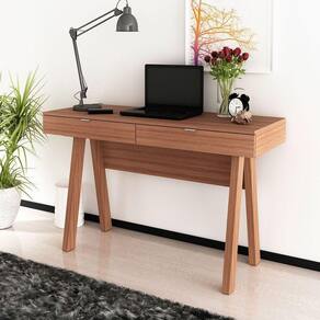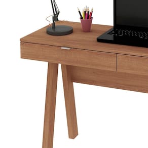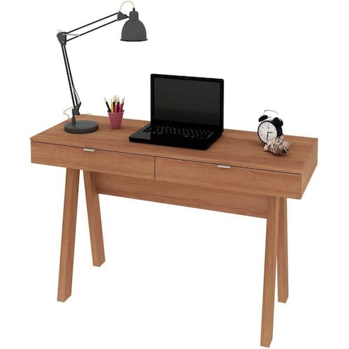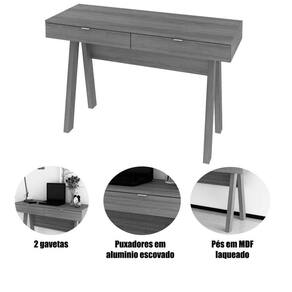 Características da Escrivaninha para Escritório Cavalete 2 Gavetas: - Estrutura em MDP; - Acabamento em BP; - 2 gavetas; - Puxadores em alumínio escovado; - Escrivaninha tipo cavalete; - Suporta até 20kg no tampo e 3kg cada gaveta; - Não acompanha objetos decorativos; - Para uma limpeza mais efetiva, utilizar apenas pano macio umedecido e sabão neutro. Não utilizar produtos abrasivos; - Montagem por conta do comprador;