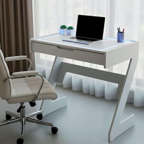 Escrivaninha para Escritório com Luz Neon Branco. Transforme seu espaço de trabalho com a nossa moderna escrivaninha com LED NEON AZUL embutido, onde design, funcionalidade e estilo se encontram! Com linhas arrojadas e estrutura robusta, ela é perfeita para quem busca um ambiente organizado, sofisticado e produtivo. O destaque fica por conta da iluminação LED integrada à mesa, que oferece uma atmosfera elegante e agradável para estudar ou trabalhar, mesmo em ambientes com pouca luz. A gaveta embutida proporciona praticidade para guardar itens essenciais, mantendo o tampo sempre livre e clean. Ideal para escritórios, home office ou quartos modernos. Profissionalismo e bom gosto em um só móvel!