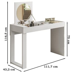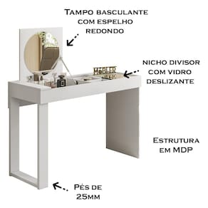 Escrivaninha Penteadeira Reppy 112 cm, uma excelente opção para você que busca design funcional, moderno e fácil de incluir em qualquer ambiente. Estrutura em MDP de 15 e 25 mm, pintura com acabamento em UV (Fosco). Composta por tampo basculante com pistão a gás, dobradiças metálicas e espelho redondo, nicho divisor organizacional com vidro deslizante para objetos e maquiagens e acompanham sapatas plásticas. Suporta até 25kg. Perfeita para organizar suas maquiagens ou outros produtos proporcionando praticidade e conforto. Este móvel chegará na sua casa separado em 1 volume.