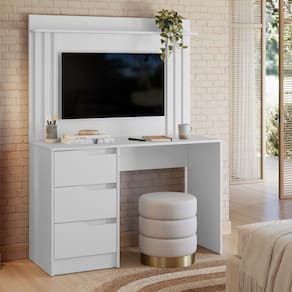 A Escrivaninha Ripada Doble Albatroz, ideal para TVs de até 42 polegadas. Possui design moderno com detalhes ripados, 3 gavetas com corrediças telescópicas e estrutura em MDP de 12 e 15mm. O tampo suporta até 15kg e cada gaveta até 5kg. Fundo em HDF de 3mm para maior estabilidade.