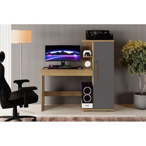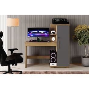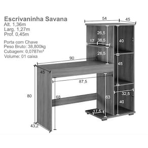 Escrivaninha funcional e elegante: perfeita para seu home office, com design moderno, espaço otimizado e excelente acabamento. Transforme seu ambiente de trabalho com praticidade e estilo com a escrivaninha Savana.\nMedidas Produto Montado Altura: 136 cm Largura: 127 cm Profundidade: 45 cm Peso: 39 Kg 1 Volume Informações Técnicas Material da estrutura: MDF 15 mm Acabamento Pintura: Pintura U.V. e Verniz Amadeirado Escala de brilho: Fosco Possui prateleiras: Sim Quantidade de prateleiras: 3 Possui espaço para CPU do computador: Sim Porta com Chave Possui furação para passagem de cabos: Sim.\nRecomendações de limpeza e manutenção: Utilizar pano macio, seco ou ligeiramente umedecido com água. Observações: Não oferecemos serviço de montagem, mas todos nossos produtos possuem manual de montagem com o passo a passo. Recomendamos contratar um profissional de montagem.