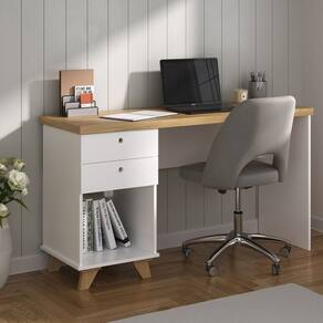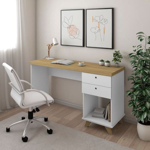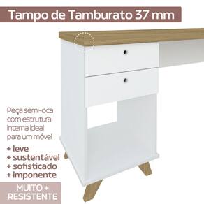 Trabalhe e estude de maneira organizada e produtiva com esta linda escrivaninha, perfeita para você transformar o ambiente em um local agradável e charmoso. Seu belo design retrô é proporcionado pelos pés angulados, detalhe que faz toda a diferença na aparência final. É muito versátil e se adapta ao seu estilo, podendo ser usada em home office, para estudo, e também em escritórios mais formais. O nicho e as gavetas são ideais para manter o local organizado, já que guardam todos os seus objetos, livros e materiais com muita elegância. O amplo tampo garante muito conforto e comodidade, para você trabalhar ou estudar com espaço para seu computador, notebook, papéis, livros e cadernos. Materiais e o revestimento de alta qualidade proporcionam a beleza e alta qualidade que sua casa merece!- Tampo em Tamburato de 37mm - Estrutura em MDP 15mm - Gavetas com corrediça metálica - Pés com feltro adesivo para proteção do piso - Lateral com sapatas plásticas - Acabamento BP - Fitas de borda em PVC - Montagem para o lado esquerdo ou direito