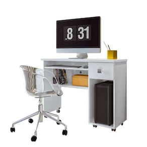 A Escrivaninha Vicenza - Lukaliam Móveis possui um design audacioso. Indicada para escritórios modernos, é uma mesa para computador compacta e funcional. Possui gaveta lateral que permite o armazenamento de documentos, prateleira inferior para que você coloque seu estabilizador, suporte para teclado acoplado com corrediças metálicas e ainda tem espaço para o cpu e caixinhas de som. Tudo que o seu escritório precisa, aproveite e leve!Dimensões do Produto Montado:Altura: 80 cmLargura: 98 cmProfundidade: 45 cmObservações:- Fabricado em MDP e MDF;- Puxador termoplástico;- Rodízios;- Suporte para teclado acomplado com corrediças metálicas;- Tampos em MDP de 25mm;- Pintura ultravioleta com acabamento brilho.