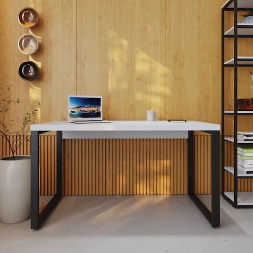 A mesa Yon YOME7135 combina funcionalidade com o design industrial. O tampo desta mesa é engrossurado em 40mm e as bordas possuem acabamento em fita de PVC de 01mm, proporcionando durabilidade e uma superfície muito resistente. Os pés são feitos em tubos de aço 30x50mm, conferindo estabilidade, robustez e uma imponente qualidade. Sua combinação de materiais e proporções bem pensadas a tornam uma opção de escolha versátil e elegante para ambientes corporativos ou home offices. Acabamento do Tampo: BP Acabamento dos Pés: Pintura Acompanha Manual de Instalação: Sim Ambiente Principal: Escritório Complexidade da Montagem: Média: pode ser montado por mais de uma pessoa e/ou necessite de maior conhecimento para montagem Cor: Branco/Preta Cor da Base: Preto Cor do Produto: Branco/Preta Cor do Tampo: Branco Dobrável: Não Escala de Brilho: Fosco Espessura do Tampo: 40 mm Formato: Retangular Itens Inclusos: 1 Mesa Manual de Montagem e Instalação: https://cdn2.madeiramadeira.com.br/prd/compace-sala-de-jantar/2365958-1727101455-951097-109902.pdf Material da Estrutura: Aço Material do Tampo: MDP Material dos Pés: Aço Material Principal: MDP Necessita Montagem: Sim Origem do Produto: Nacional Pés com Regulagem de Altura: Não Pés Reguláveis: Não Peso: 19,427 kg Possui Painel: Sim Possui Passa Cabos: 01 Possui Porta Objetos: Não Possui Portas: Não Possui Prateleiras: Não Possui suporte para CPU: Não Possui Suporte para Teclado: Não Possui Vidro: Não Recomendações de Uso, Manutenção e Limpeza: Para a limpeza, utilize flanela seca ou pano macio levemente umedecido em água. Utilize um pano seco em seguida. Evite contato com produtos químicos (solventes, thinner, acetona, etc) e não utilize nenhum tipo de esponja de aço. Sapatas Niveladoras: Sim Sistema de Montagem: Parafuso, Cantoneira L, Sapara Niveladora Suporta Até (kg): 90 kg Marca: Metalig