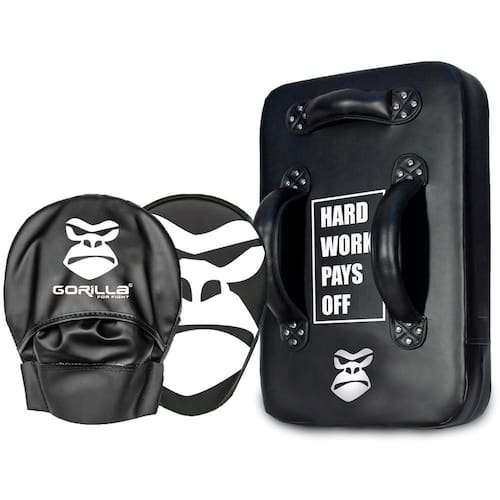 Escudo De Chute + Manopla De Foco Gorilla. O kit acompanha: 01 Escudo De Chute Profissional UND - Gorilla 01 Manopla De Foco Profissional PAR - Gorilla Escudo De Chute / Aparador De Chute Gorilla Fabricado em policloreto reforçado, projetado para receber muita porrada sem desgastar. Preenchido com duas camadas de diferentes densidades proporcionando proteção e conforto ao atleta. Possui quatro áreas de respiro que permitem redução das forças internas no momento da pancada. sua costura foi aprimorada com uma linha especial para a categoria dando maior segurança em seu treino além de prolongar a vida útil do produto. Contém três pegadores anatômicos deixando a pegada confortável e segura evitando o desgaste do treinador. Os pegadores são reforçados com rebites prolongando a vida útil do produto. Indicações: treino de velocidade, potência e precisão. Dimensões aproximadas 60x40x12. Acompanha o produto: Um escudo de chutes unidade Manopla De Foco - Boxe - Muay-thai - Gorilla A Manopla De Foco tem seu formato anatômico proporcionando maior precisão no deferimento dos socos. Ela é fabricada em PU reforçado a manopla de foco é preenchida com duas camadas de diferentes densidades proporcionando proteção ao atleta. Preenchimento: Espuma alta densidade e EVA; Indicações: treino de velocidade, potência e precisão Acompanham o produto: 01 Par de manopla. Garantia: 07 meses Fabricado por Gorilla Indústria e Comércio LTDA. Produto 100% nacional.