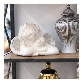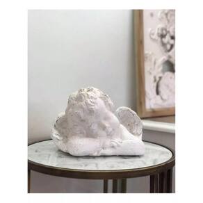 Escultura Anjo Resina Branco Sonho Angelical 29x18x19 A escultura em MGO captura um anjo em um estado de repouso profundo, como se estivesse dormindo suavemente sobre os braços. A figura é delicada e serena, com as asas levemente abertas, em um gesto que transmite proteção e calma.