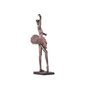 Escultura feita em Resina na fisionomia de bailarina com os braços em posição arredondada. um em direção do umbigo e o outro acima da cabeça, sobre uma base também de resina na cor preta.
