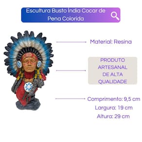A Escultura Busto Índia Cocar de Pena Colorida da Bialluz, trará boas energias, bons fluídos e harmonia para sua casa. É ideal para colocar em seu altar ou completar a decoração de seu ambiente. Esculturas são itens especiais e decorativos, é um recurso que dá um toque a mais em qualquer ambiente, tem um valor espiritual e sentimental. Você pode enfeitar com um estilo próprio com muito bom gosto o seu altar ou ambiente. Essa imagem evoca elementos culturais e simboliza a conexão com as tradições indígenas, destacando a importância das penas como símbolos de significado espiritual, cultural e histórico.