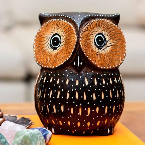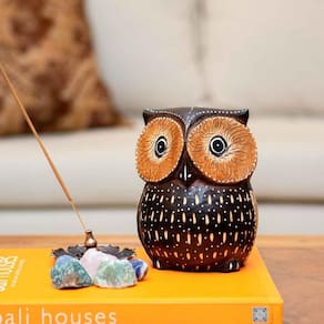 Escultura Coruja de Madeira Balsa Importada de Bali 16cm Escultura Coruja de Madeira Balsa Importada de Bali 16cm A coruja é a ave soberana da noite e para muitos povos elas simbolizam o mistério, a inteligência, a sabedoria e o conhecimento. Simboliza também a reflexão e o conhecimento intuitivo. Nossa coruja decorativa é perfeita para trazer charme ao ambiente. É feita de madeira balsa e pintada à mão com a técnica dots muito utilizada pelos balineses. Adquira a sua coruja e deixe a sua casa ou escritório mais bonito. Material: madeira balsa Cores Predominantes: Marrom Escuro Peso: aproximadamente 325g Largura: 9cm Altura: 16cm Profundidade: 9cm Origem: bali O produto é artesanal, fabricado e de Bali e por isso pode apresentar pequenas variações de cor, tonalidade, brilho, peso e tamanho. Não deixe a sua peça em contato prolongado com a água, a não ser que seja peça que possa ser exposta ao sol e chuva. As fotos são ilustrativas. Qualquer produto adicional utilizado na composição das fotos deve ser comprado separadamente. Marca: Balisun Ean: 7891126674328
