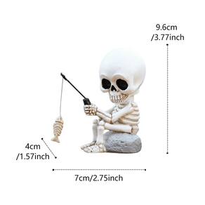 Material: Resina Tamanho: 13* 12,5* 8 cm Peso: 175 g ['Creepy Fishing Skeleton Design — Apresenta uma figura esquelética humorística sentada com uma vara de pescar, combinando charme assustador com detalhes divertidos para decoração de jardins de Halloween. ', 'Bobble Head Feature — A cabeça do crânio se move suavemente, adicionando movimentos realistas e animações assustadoras a exibições externas em bordas de pátios, lagoas ou degraus. ', 'Figura de resina durável — Feita de resina sólida, esta escultura é resistente às intempéries e adequada para colocação de longo prazo em jardins, pátios ou varandas. ', 'Enfeites compactos de Halloween — Medindo 13 × 12,5 × 8 cm, cabe facilmente entre lápides, abóboras, canteiros de flores ou cenas assustadoras de mesa. ', 'Estátua assustadora versátil — ideal para jardins mal-assombrados, decoração sazonal, exibições em lagos ou detalhes em prateleiras internas com tema gótico ou de terror.']