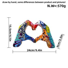 Material: resina Tamanho: 24x9x15,5 cm Peso: 570 g Design vibrante de grafite — Esta escultura apresenta duas mãos formando um coração, aprimorada com elementos de grafite atraentes que a tornam uma declaração artística ousada. O estilo de rua encontra a decoração da casa — Combinando arte urbana com escultura moderna, esta peça adiciona uma energia dinâmica e criativa a qualquer espaço, de salas de estar a estúdios de design. Construção em resina de alta qualidade — Feita com resina durável e finalizada com efeitos de spray multicoloridos detalhados para uma superfície lisa e brilhante que se destaca. Tamanho ideal para exibição — Medindo 24x9x15,5 cm e pesando 570 g, é a peça central de mesa perfeita para ambientes domésticos, de escritório ou de galeria. Decoração moderna versátil — Um ornamento de decoração único e expressivo que complementa estilos de interiores contemporâneos, pop art ou ecléticos com personalidade e elegância.