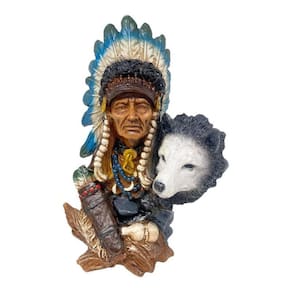 Escultura Índio Xamã com Lobo Lado Cocar 24 cm em Resina Escultura Índio Xamã com Lobo Lado Cocar 24 cm em Resina
