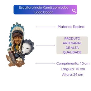 A Escultura Índio Xamã Guardião da Bialluz, trará boas energias, bons fluídos e harmonia para sua casa. É ideal para colocar em seu altar ou completar a decoração de seu ambiente. Esculturas são itens especiais e decorativos, é um recurso que dá um toque a mais em qualquer ambiente, tem um valor espiritual e sentimental. Você pode enfeitar com um estilo próprio com muito bom gosto o seu altar ou ambiente. O Índio Xamã com um lobo pode simbolizar a conexão espiritual entre o Xamã e a natureza, representando a orientação espiritual, coragem, lealdade e a busca por transformação e renovação.