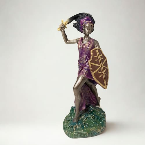 Imagem de Obbá, a orixá guerreira, símbolo de força feminina, coragem e sabedoria. Representada com espada erguida e escudo decorado, essa escultura de 20 cm exala proteção, bravura e ancestralidade. Uma peça marcante, ideal para altares, ambientes de fé ou como objeto de devoção e respeito às tradições do candomblé e umbanda. Produzida em resina resistente e finalizada com pintura artesanal em tons vibrantes, a peça carrega riqueza nos detalhes e presença visual impactante.